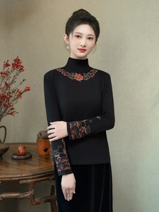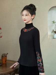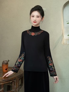 【海浪牡丹】民族风刺绣长袖T恤女秋季半高领内搭小衫国风打底衫