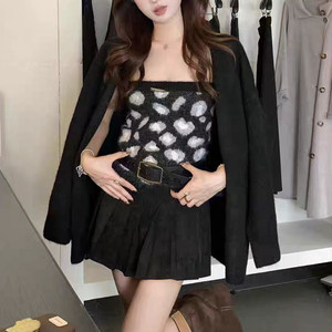 秋冬新款宽松慵懒风花豹纹毛衣挂脖吊带背心套装时尚气质针织女