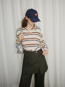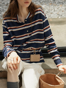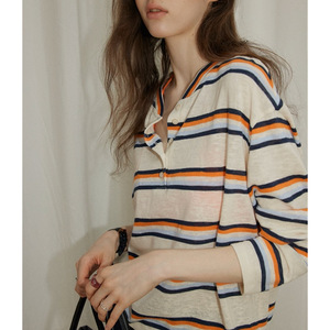 半开领撞色条纹长袖T恤女美式复古休闲慵懒初秋宽松上衣