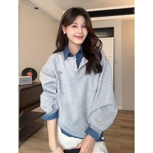 假两件格子拼接卫衣POLO领宽松显瘦小众女装秋季新款时尚百搭上衣