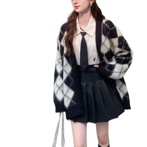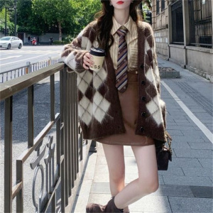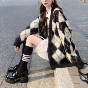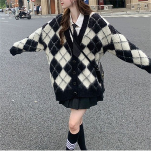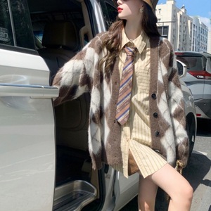 2025跨境韩版格纹针织开衫外套女秋季新款慵懒风宽松毛衣复古上衣