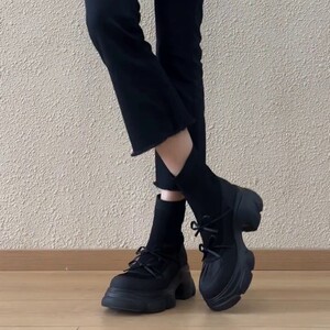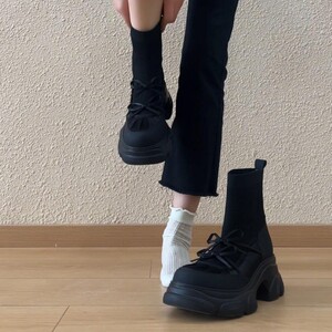 软皮版~2025新款厚底弹力靴女英伦休闲风拼接蝴蝶结松糕底瘦瘦靴