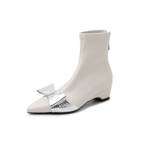 绝美~拼色蝴蝶结瘦瘦靴配裙子2025冬粗中跟尖头弹力短靴女42大码