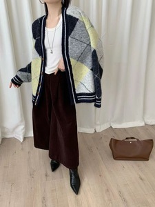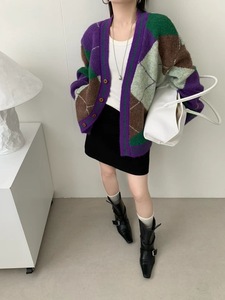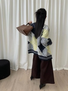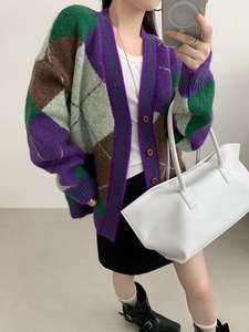 复古风菱格拼色V领针织毛衣开衫韩版宽松显瘦设计感针织衫上衣女