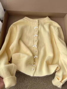 粉玥黄色蝴蝶结珍珠扣毛衣外套女2025秋季新爆款温柔风针织开衫