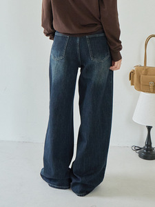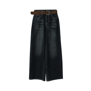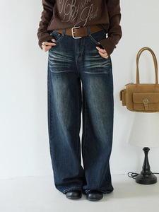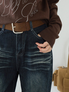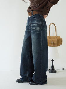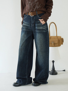 【欧凡】复古风潮猫抓纹做旧水洗直筒牛仔裤女秋冬新款阔腿裤3226