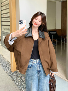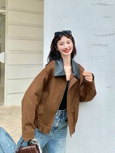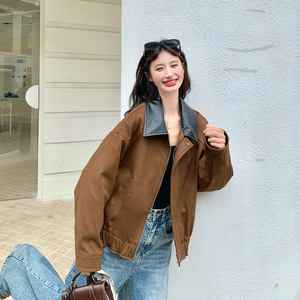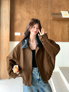 美式复古风撞色翻领短款麂皮绒夹克女秋季小个子拼接机车上衣外套