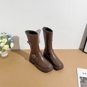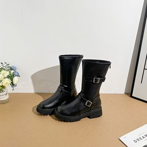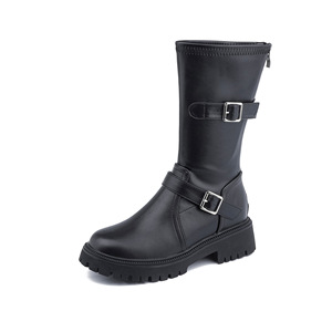 厚底英伦风靴子女中筒靴后拉骑士靴长筒靴皮带扣秋冬机车皮靴