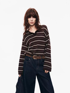 100%美丽诺羊毛亨利领针织长袖条纹撞色打底衫薄款宽松显瘦针织衫