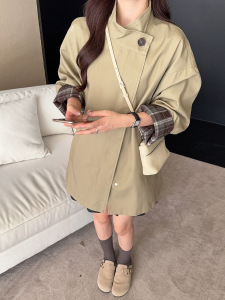 大码女装微胖mm英伦风复古高级撞色中长款宽松风衣外套