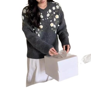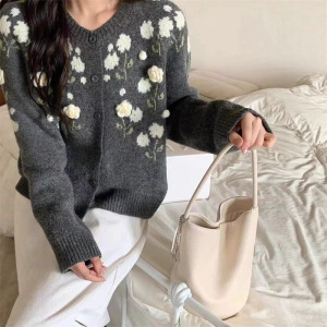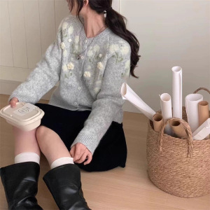 温柔风毛衣外套女秋冬新款设计感宽松清新甜美风花朵针织开衫上衣