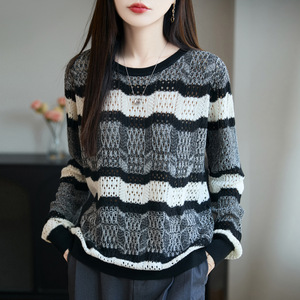 哥家商场同款女装2025秋季新款羊毛条纹镂空长袖针织衫开衫女毛衣