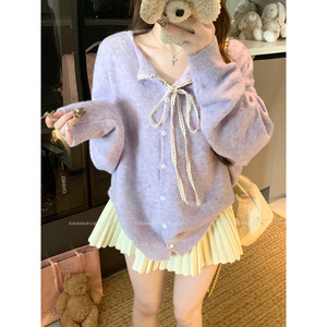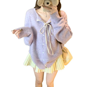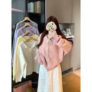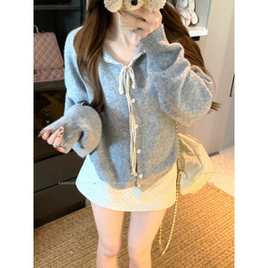 大码女装蕾丝系带毛衣开衫外套女软糯温柔气质休闲针织上衣