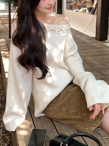 镂空花边一字领针织衫女秋长袖宽松慵懒上衣