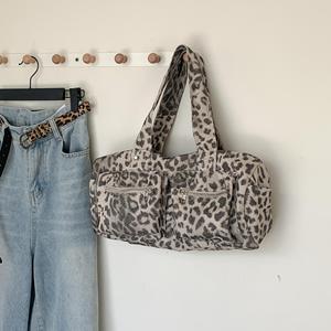 跨境圆筒豹纹包复古多口手提包大容量韩国新款小众高级感单肩包女