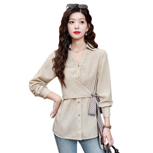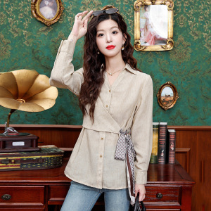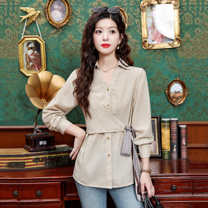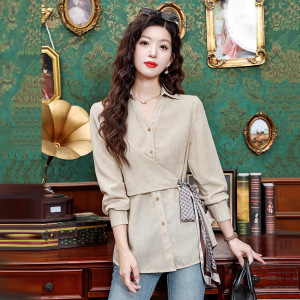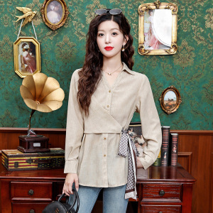 2025秋季新款时尚法式慵懒感肌理感V领丝巾绑带收腰显瘦长衬衫