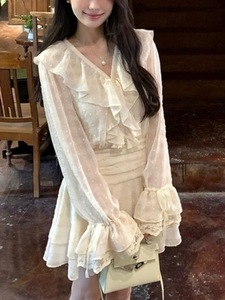 复古重工浮雕蕾丝荷叶边V领连衣裙女春少女灯笼袖短裙