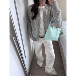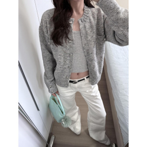 miu系穿搭毛衣外套女早秋镶钻设计感针织开衫慵懒风软糯灰色上衣