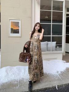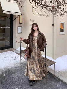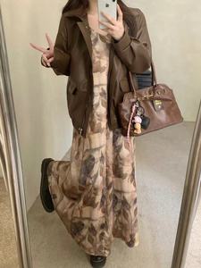 大码女装秋季时尚穿搭翻领复古皮衣外套中式印花吊带裙两件套