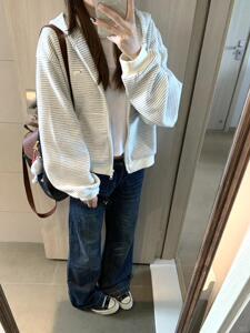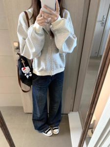 大码韩系慵懒风条纹连帽卫衣女春秋2025新款宽松休闲百搭上衣批发
