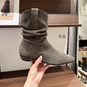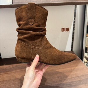 2025年秋冬新款真皮尖头粗跟西部牛仔靴中筒短靴子女V口骑士靴潮