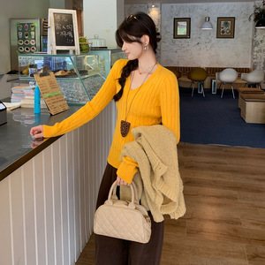 韩系杏色v领麻花长袖针织衫女秋冬季纯欲修身显瘦气质毛衣上衣