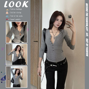 美式辣妹长袖T恤女装2025早秋新款打底衫灰色修身显瘦设计感上衣