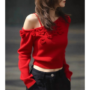 韩系氛围感早秋穿搭气质独特漂亮小众设计立体花朵红色斜肩针织衫