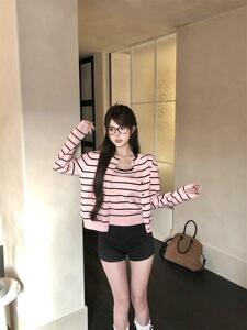 超火韩女设定 甜辣黑粉条纹撞色挂脖背心上衣针织开衫套装