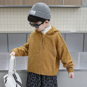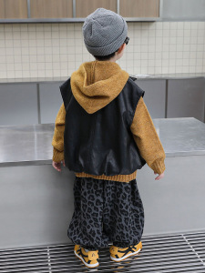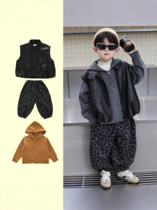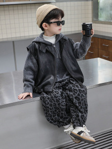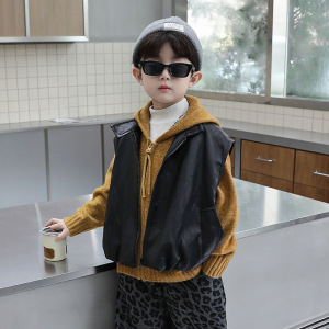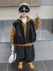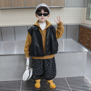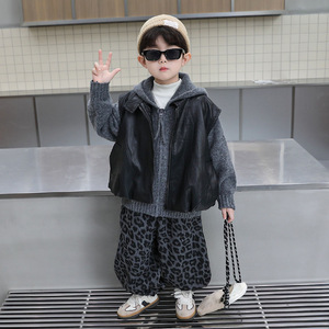 9732男童春秋冬季套装2025新款儿童皮衣马甲三件套男孩宝宝毛衣潮