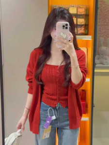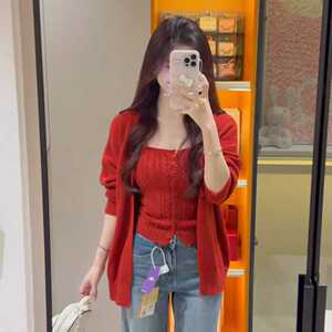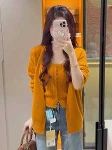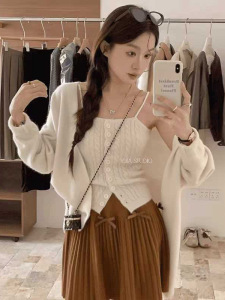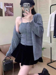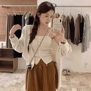 羊绒外套秋季橘色慵懒风麻花针织衫两件套装吊带背心宽松纯色女士