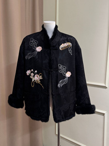 实拍兔毛国潮毛毛真毛整皮兔毛皮毛一体女刺绣新中式国风皮草外套