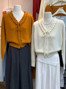 2025早秋新款女装小众设计木耳边V领单排扣气质通勤百搭针织开衫