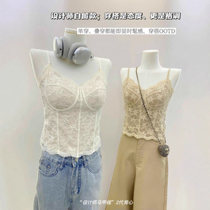 法式蕾丝V领吊带背心带胸垫一体式内衣聚拢内搭打底修身美背上衣