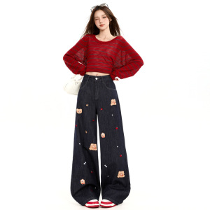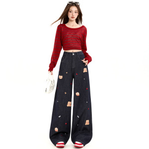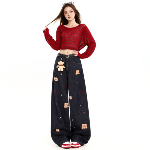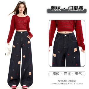 卡通刺绣小熊丹宁蓝牛仔裤女2025秋季新款宽松阔腿显瘦百搭直筒裤