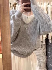 2025秋冬新款撞色假两件爱心扣针织衫女宽松软糯温柔风毛衣套头潮
