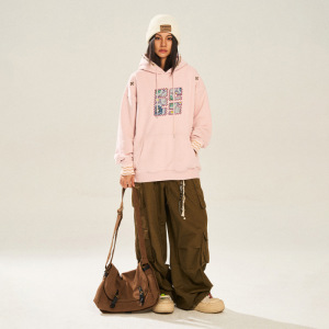 美式复古粉色连帽卫衣外套女春季设计感小众宽松oversize休闲上衣