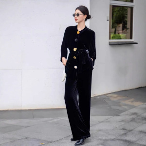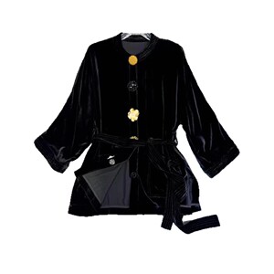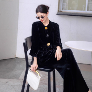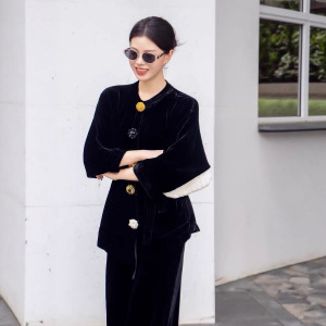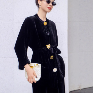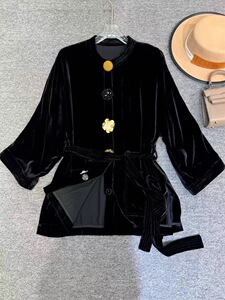 2025新品轻奢法式篙定扣落肩袖真丝丝绒上衣气质系带收腰显瘦外套