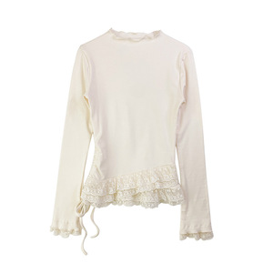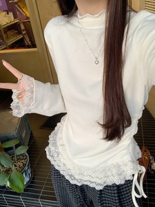 奶油白双层蕾丝半高领长袖T恤女秋冬2025新款抓绒修身抽绳上衣潮
