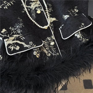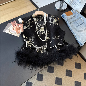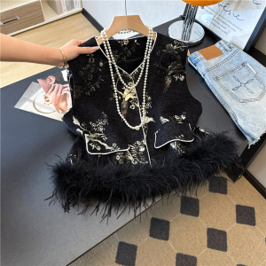 新款新中式复古马夹2025秋季新款国风拼接驼鸟毛坎肩上衣女黑色