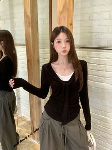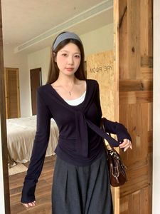 韩系撞色绑带假两件T恤女秋季设计感别致V领收腰显瘦气质百搭上衣