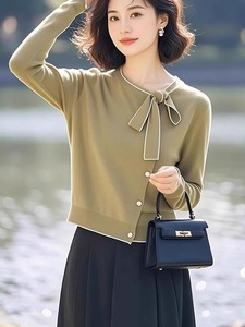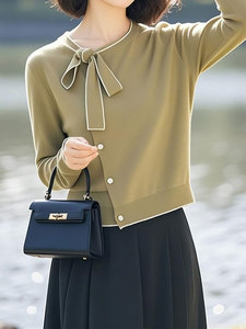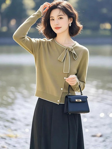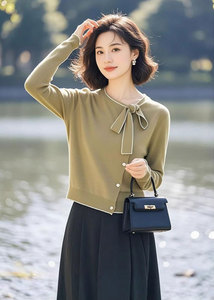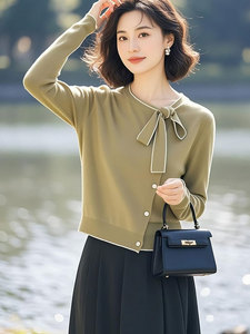 减龄绿色系带长袖针织毛衣女巨好看的一整套新款百褶半身裙两件套