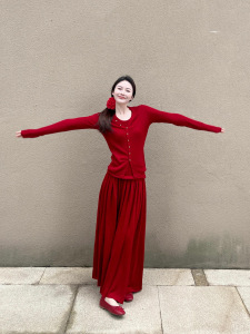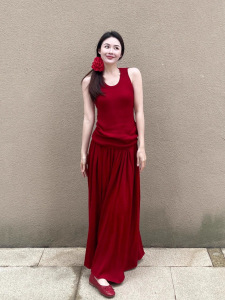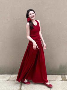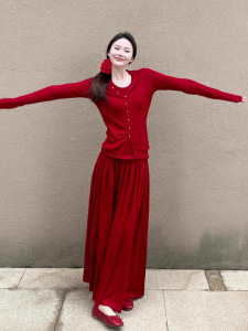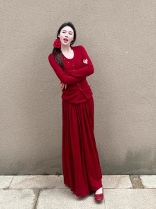 红色复古针织套装裙女2025早秋新款法式气质度假风三件套