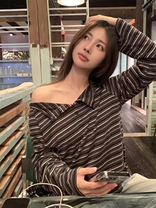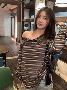 秋季新款高级感慵懒风宽松一字领条纹露肩纽扣百搭长袖上衣ins潮