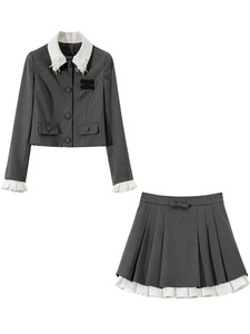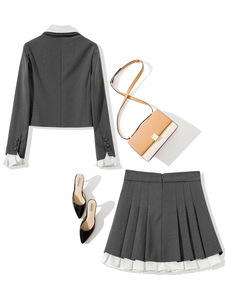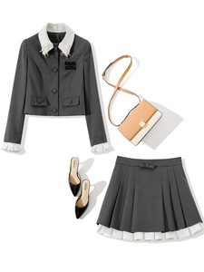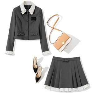 T1774 2025年秋装新款钉珠翻领长袖上衣配百褶半裙两件套裙装