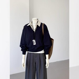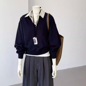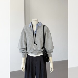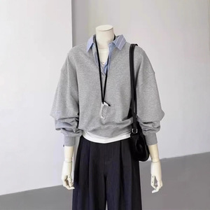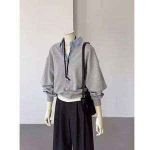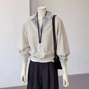 假两件polo领灰色卫衣女款2025新款韩系早秋设计感小众高级感上衣