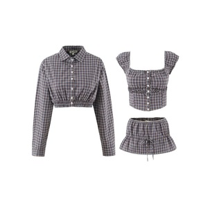 欧美ins博主款POLO领长袖衬衫方领无袖背心低腰褶皱半身裙三件套