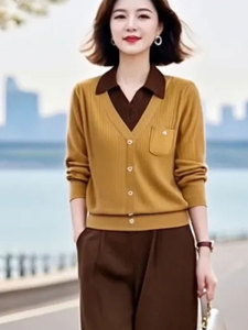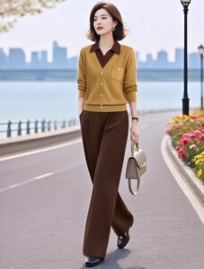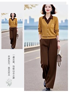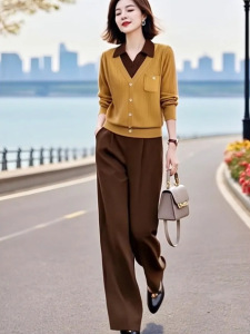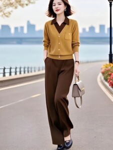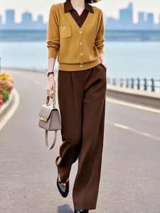 女装2025秋季新款气质显瘦假两件翻领针织开衫时尚阔腿裤两件套