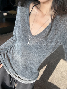YOLO SHOP 灰色羊驼毛高比例气质V领百搭针织毛衣修身打底衫上衣