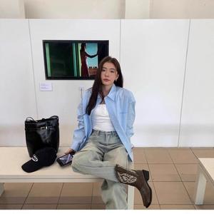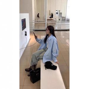 蓝色纯棉百搭衬衫女秋季新款韩系休闲纯棉宽松慵懒风外套长袖衬衣